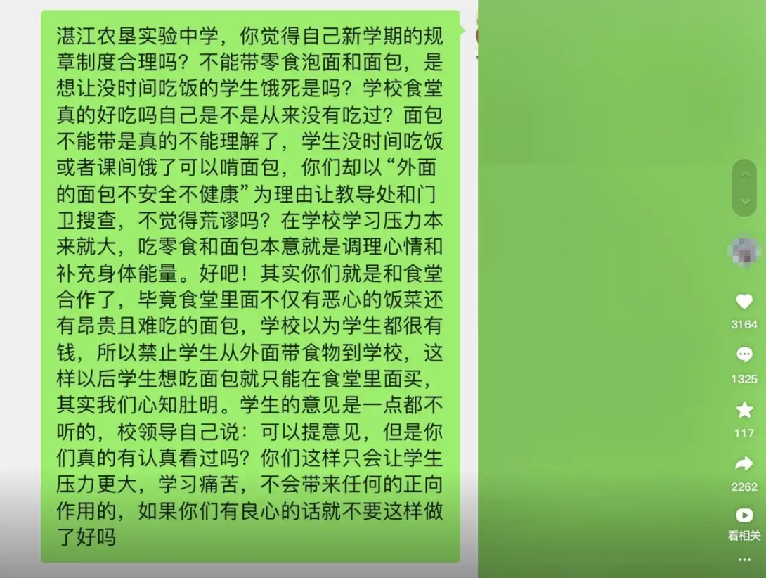 據奔流新聞此前報道,2月16日,社交媒體上一段“湛江農墾實驗中學新學期開學禁止學生攜帶麪包、泡麪等零食入校,但學校食堂卻售賣不怎麼好吃且價格較高的麪包”的視頻,引發關注。