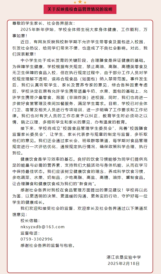 廣東省湛江農墾實驗中學微信公眾號“湛江農墾實驗中學”2月18日發佈《關於反映我校食品管理情況的説明》。