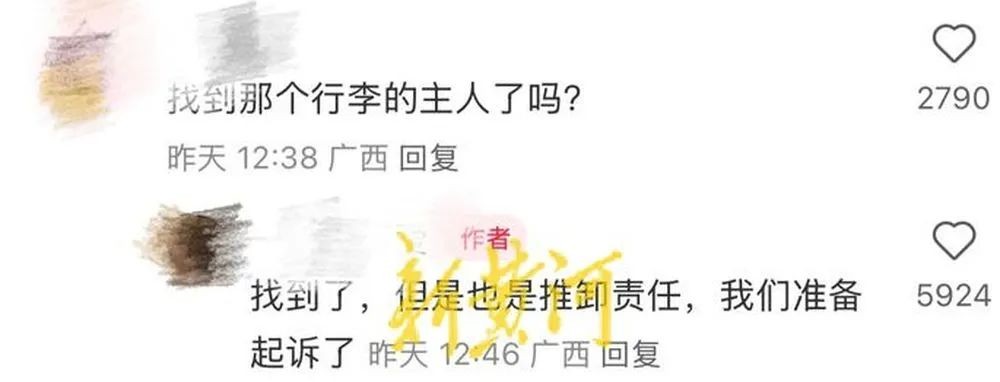 2月19日,張女士最新回覆網友留言時表示,“已找到行李的主人,準備起訴”。同日,記者致電南寧鐵路12306客服熱線,客服工作人員稱已將該情況記錄並反饋給相關部門,請關注後續通報。隨後,記者又致電該趟列車的擔當局廣州鐵路12306客服熱線,工作人員稱目前他們暫不掌握該情況。