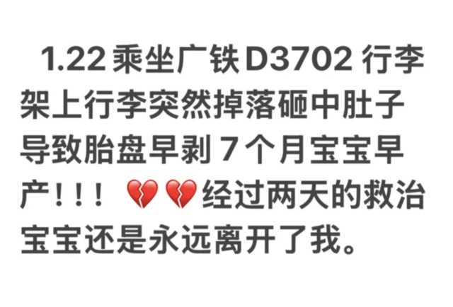 2月18日,網友張女士在社交媒體平台發文稱,1月22日,她乘坐動車在南寧東至南寧站區間,被同車廂其他旅客掉落的行李砸中腹部,導致其7個月大的胎兒早產,經過兩天的救治後,孩子最終離世。張女士稱,事發後鐵路部門以及行李箱的主人針對此事互相推諉,均不承擔責任。