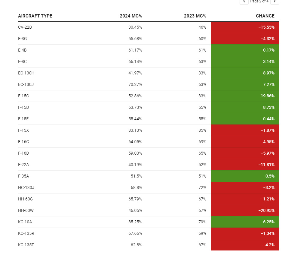 CV-22魚鷹在一次致命的墜機事故後,在2024年的大部分時間裏都停飛了,因此只有30.45%的可執行任務率。