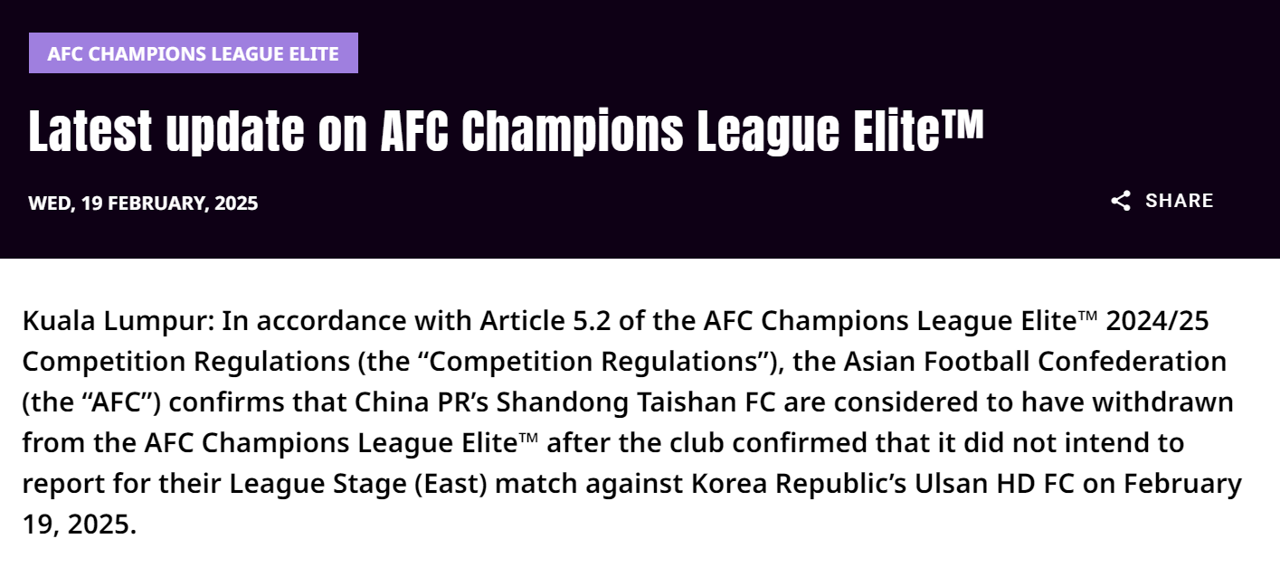 但亞足聯在官網發佈的公告中表示:“根據亞冠精英聯賽2024-25賽季競賽規程第5.2條規定,亞足聯確認山東泰山因明確表示不參加原定於2月19日對蔚山現代的亞冠比賽,被視為退出本賽季亞冠精英聯賽……該事項將提交亞足聯相關委員會酌情作出後續決定。”
