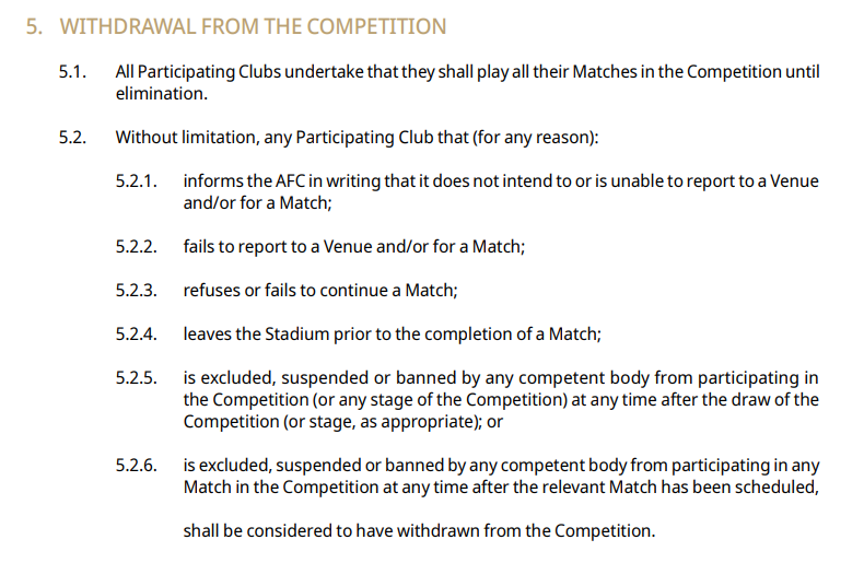 亞冠精英聯賽2024-25賽季競賽規程第5.2條規定,存在以下行為被視為退出亞冠精英聯賽:1、書面通知亞足聯不打算或無法到場地報到/參加比賽;2、未能到場地報道/參加比賽;3、拒絕或未能繼續進行比賽;4、在比賽結束前離開體育場;5、被抽籤階段後被任何主管機構排除、暫停或禁止參加任何階段的比賽;6、在相關比賽安排後被任何主管機構排除、暫停或禁止參加任何階段的比賽。