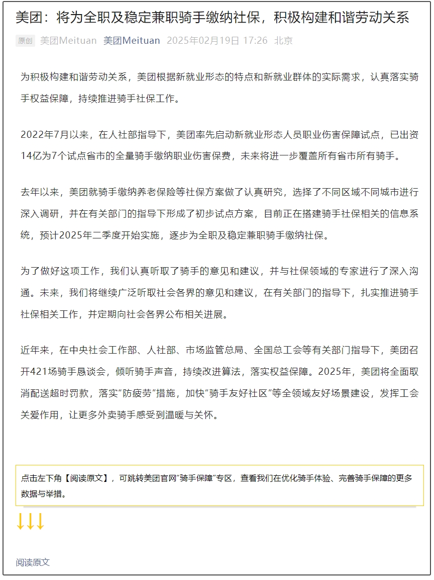 去年以來,美團就騎手繳納養老保險等社保方案做了認真研究,選擇了不同區域不同城市進行深入調研,並在有關部門的指導下形成了初步試點方案,目前正在搭建騎手社保相關的信息系統,預計2025年二季度開始實施,逐步為全職及穩定兼職騎手繳納社保。
