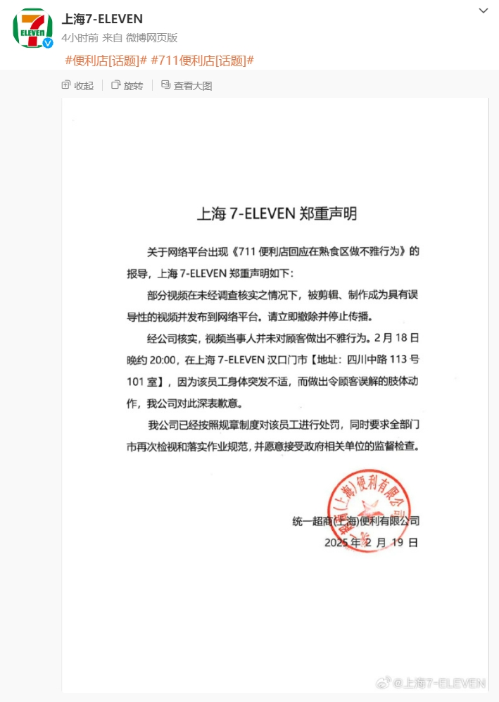 2月19日,@上海7-ELEVEN 發佈聲明: