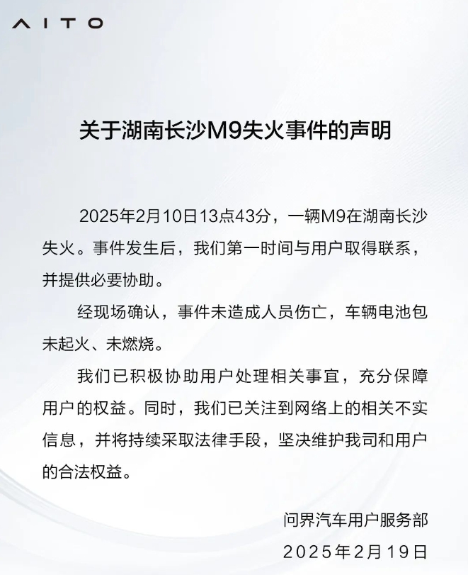 2月19日,微信公眾號“問界用户服務”發佈關於湖南長沙M9失火事件的聲明。