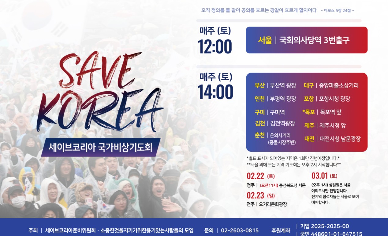 一個以“國家非常祈禱會”名義,在韓國串聯、組織集會的團體的海報,內容是每週六的集會時間地點。