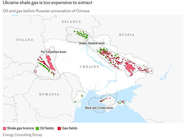 烏克蘭的頁岩氣開採成本太高,俄羅斯吞併克里米亞之前的石油和天然氣 Shale gas licence(頁岩氣許可證)、Oil fields(油田)、Gas fields(天然氣田)