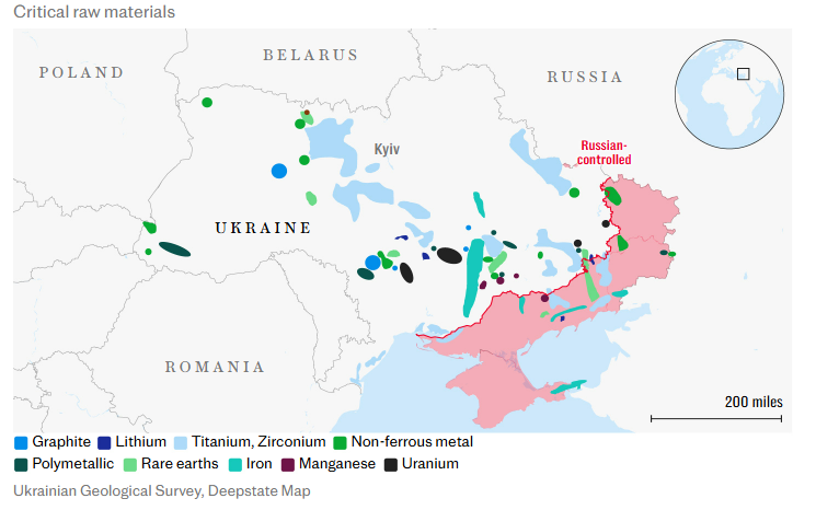 由於一些礦產盆地位於烏克蘭東部前線附近,或者處於俄羅斯佔領區,於是澤連斯基誇大了讓鈦、鎢、鈾、石墨和稀土等戰略儲備落入俄羅斯手中的危險性。他説:“如果我們在談一項協議,那就達成協議吧,我們完全支持。”