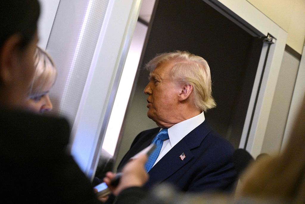 當地時間2025年2月19日,美國總統特朗普在空軍一號上與記者交談 視覺中國
