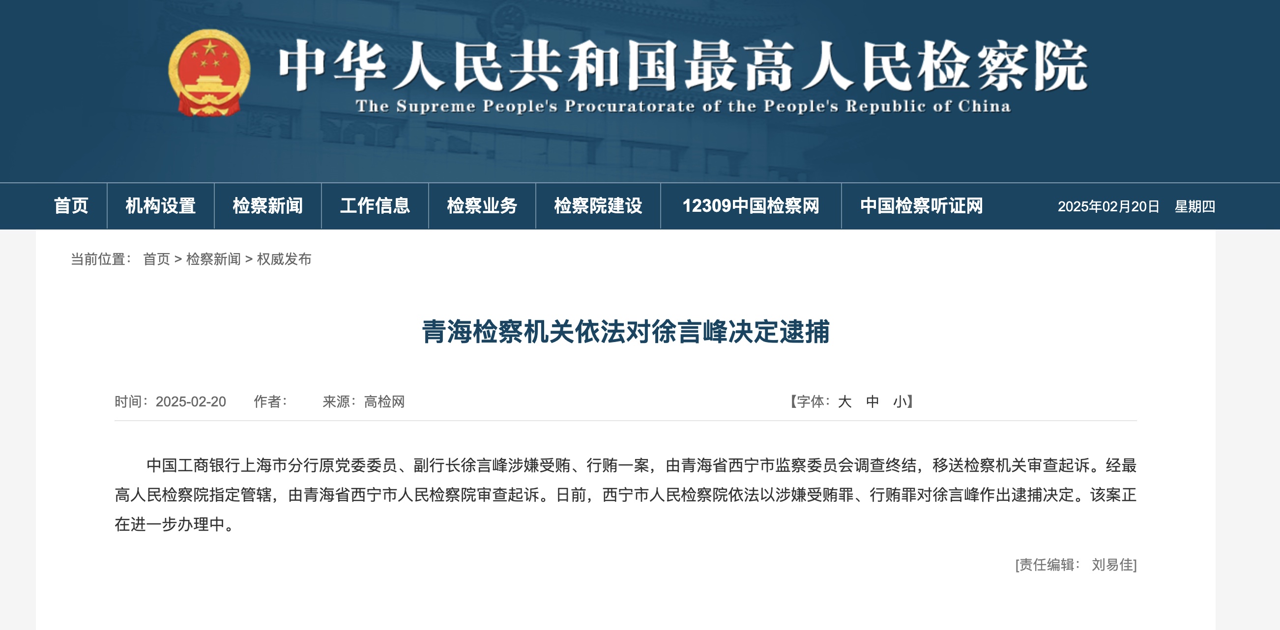 2月20日,據最高人民檢察院消息,中國工商銀行上海市分行原黨委委員、副行長徐言峯涉嫌受賄、行賄一案,已由青海省西寧市監察委員會調查終結,移送檢察機關審查起訴。經最高人民檢察院指定管轄,由青海省西寧市人民檢察院審查起訴。西寧市人民檢察院依法以涉嫌受賄罪、行賄罪對徐言峯作出逮捕決定。
