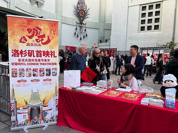 《哪吒2》在美國洛杉磯中國劇院的首映禮外擺放着宣傳中國文化的展位 視覺中國