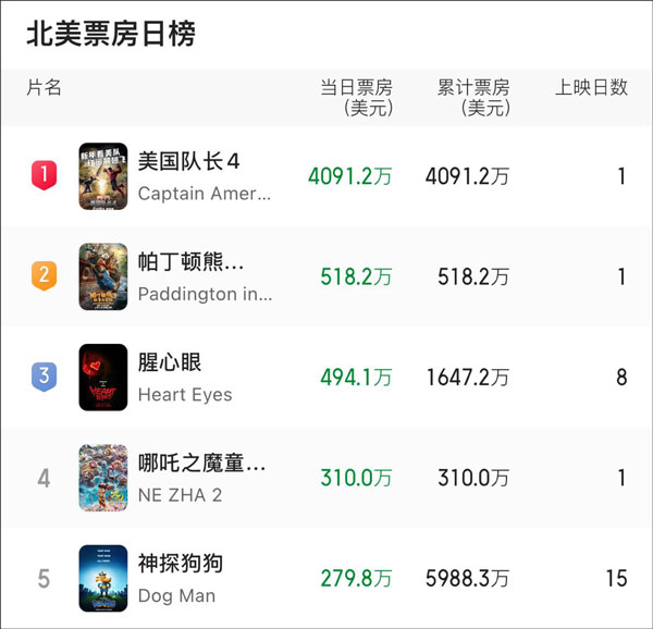《哪吒2》《美隊4》首映日(當地時間2月14日),北美日票房榜前五 貓眼專業版