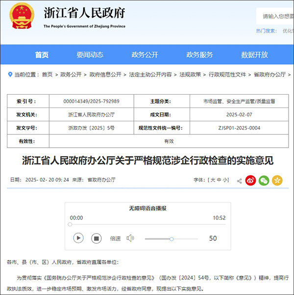 2月20日,浙江省人民政府網站公佈由省政府辦公廳印發的《關於嚴格規範涉企行政檢查的實施意見》。