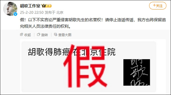 近日,網傳消息稱“演員胡歌得肺癌在北京住院”,對此,@胡歌工作室 2月20日發文闢謠:“假!以下不實言論嚴重侵害胡歌先生的名譽權!請停止造謠傳謠,我方也將保留追究相關人員法律責任的權利。”