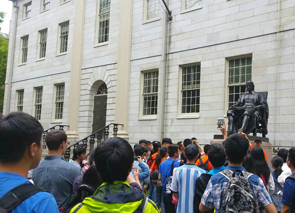 一羣中國高中生參觀哈佛大學校園。 哈佛大學雜誌