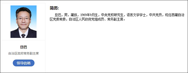 該網站介紹,旦巴,男,藏族,1969年9月生,中央黨校研究生,語言文學學士,中共黨員,現任西藏自治區黨委常委,自治區人民政府黨組成員、常務副主席。