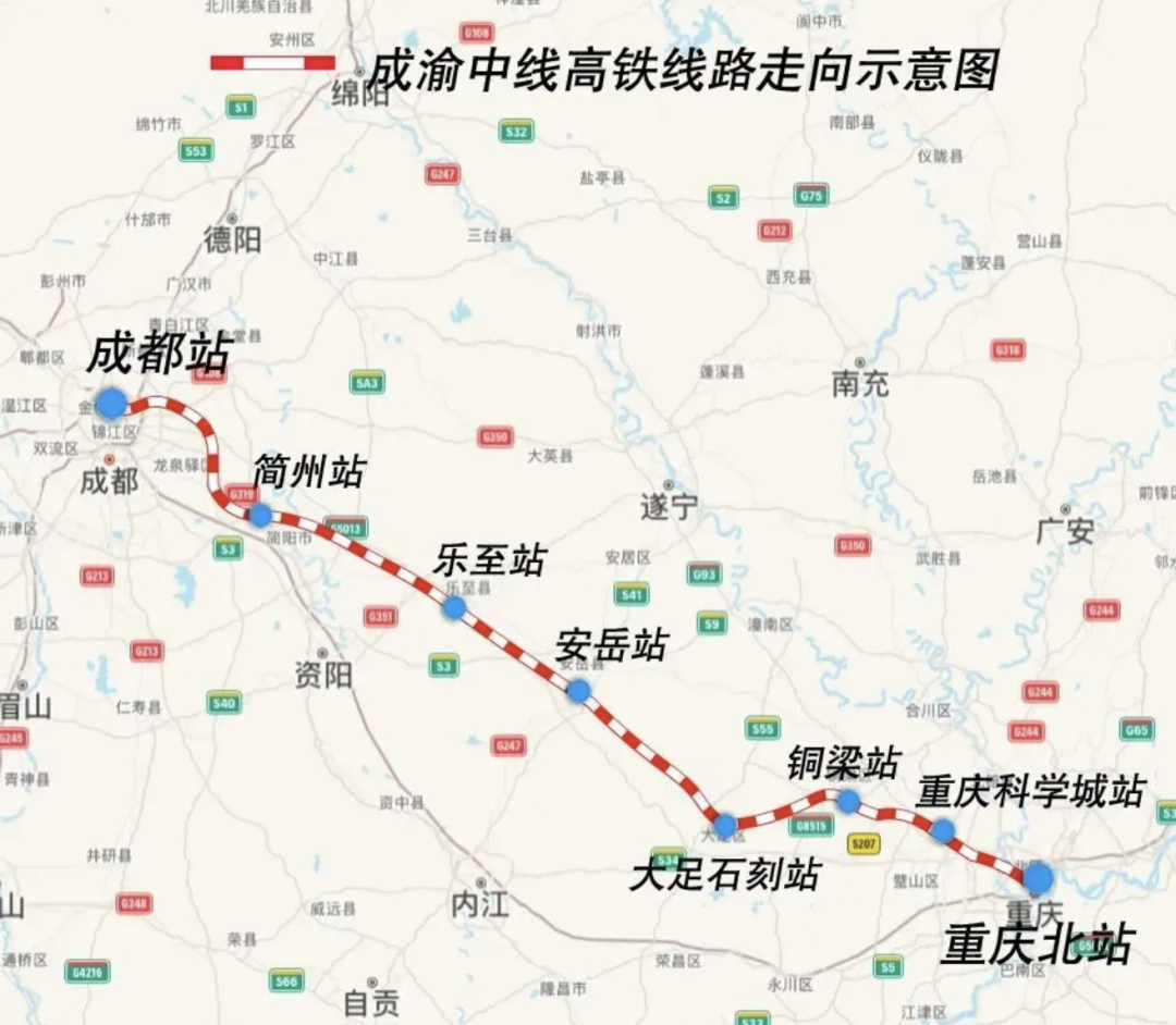 其次,預計2027年開通運營的成渝中線(成都站-重慶北站),在其聯調聯試期間,將會進一步衝高,屆時CR450兩列樣車將在線路上衝擊自身的極限。