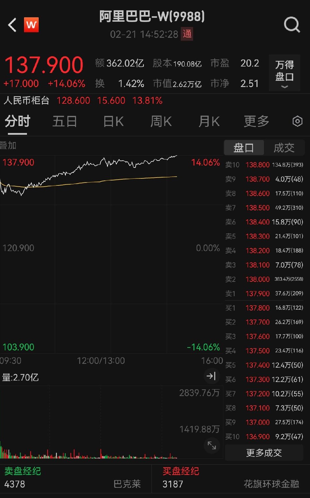 2月21日,阿里港股盤中漲超14% Wind截圖