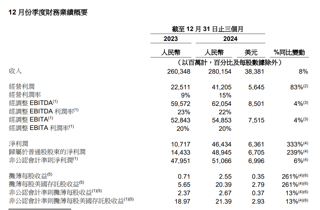 2月20日下午,阿里巴巴發佈2025財年第三季度(截至2024年12月31日止三個月)的業績。財報顯示,該季度營收2801.5億元人民幣,同比增長8%,超過分析師預期;當季阿里淨利潤464.34億元人民幣,同比增長333%。