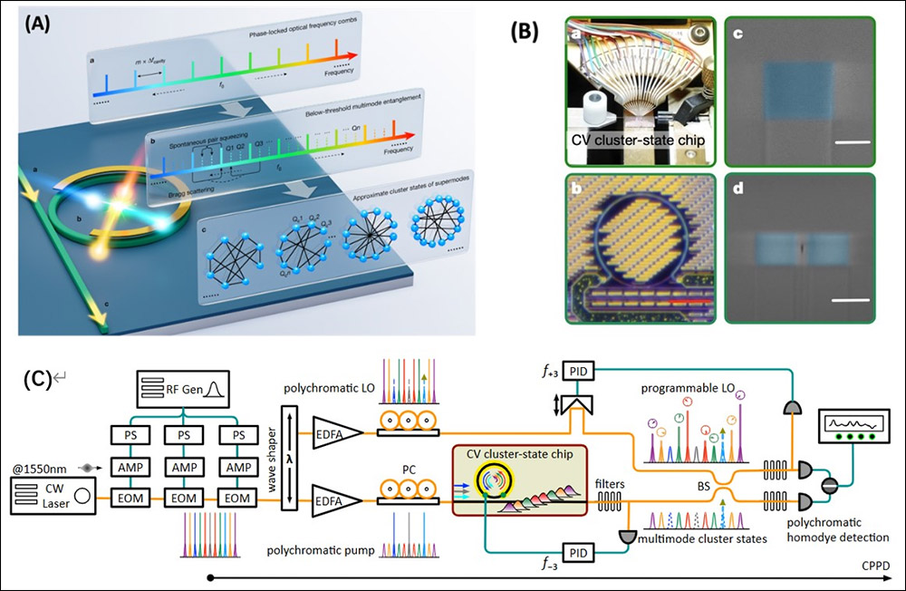 集成光量子芯片是一種能在微納尺度上編碼、處理、傳輸和存儲光量子信息的先進平台。如何在光量子芯片上實現大規模量子糾纏是國際量子研究難題。量子糾纏簇態作為一種典型的多比特量子糾纏態,是量子信息科學的核心資源,然而其確定性、大規模製備面臨巨大實驗困難,尤其連續變量簇態的光量子芯片的製備和驗證技術在國際上仍屬空白。