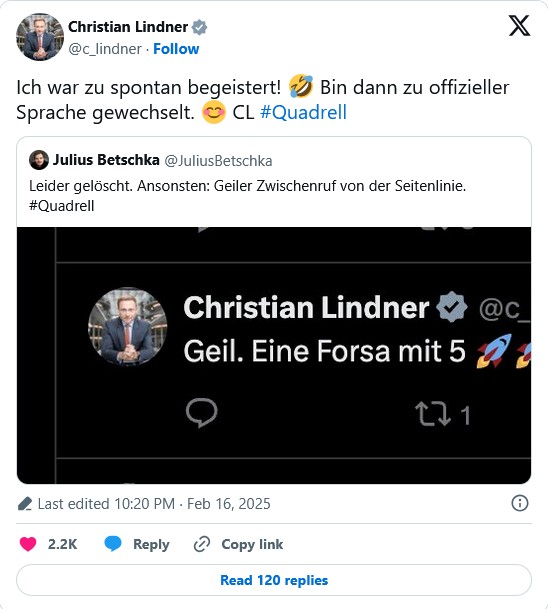 本週初,自民黨(FDP)主席林德納(Christian Lindner)在推特上難抑興奮地寫道。