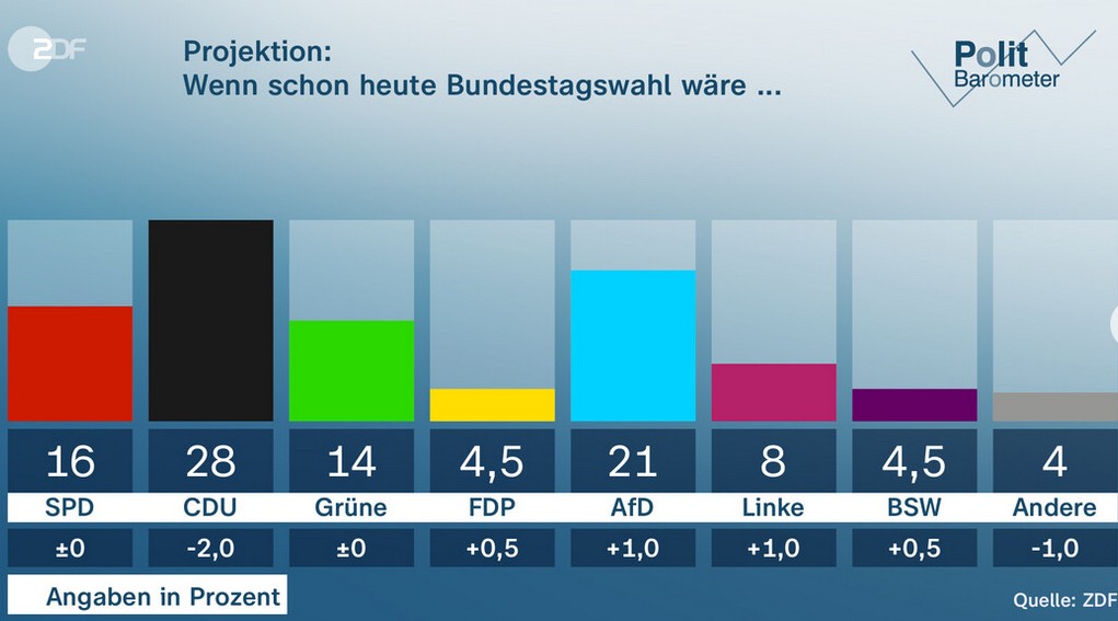 根據德國電視二台(ZDF)週五(2月20日)晚公佈的選前最後一次“政治晴雨表”(Politbarometer)數據,除聯盟黨下滑兩個百分點之外,其他各黨的基本盤相對穩定,數週以來未出現大的起伏。