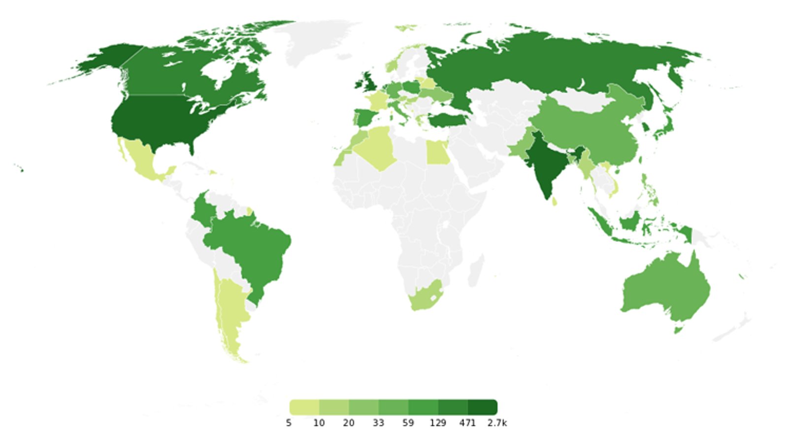 GitHub代碼庫貢獻者在世界上的分佈圖,顏色越深貢獻越多