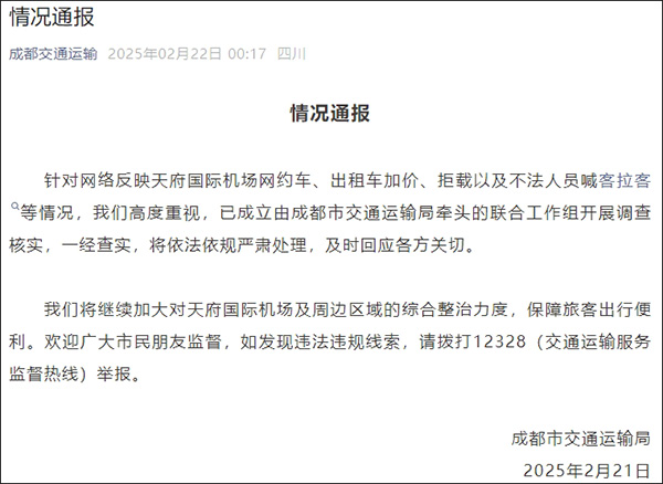 成都市交通運輸局微信公眾號“成都交通運輸”2月22日發佈情況通報稱,針對網絡反映天府國際機場網約車、出租車加價、拒載以及不法人員喊客拉客等情況,我們高度重視,已成立由成都市交通運輸局牽頭的聯合工作組開展調查核實,一經查實,將依法依規嚴肅處理,及時回應各方關切。