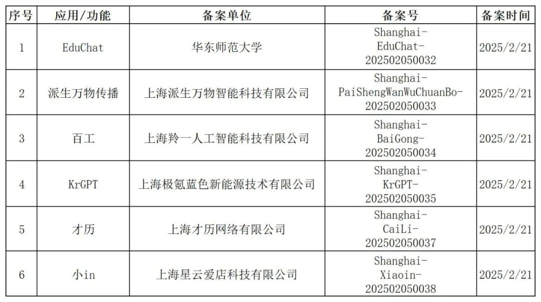 微信公眾號“網信上海”2月22日發佈《上海市生成式人工智能服務已備案信息公告(2月22日)》。