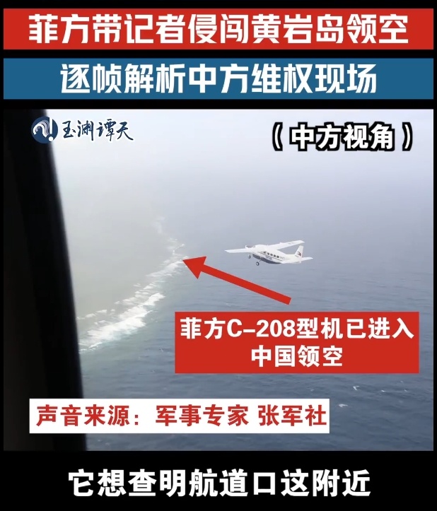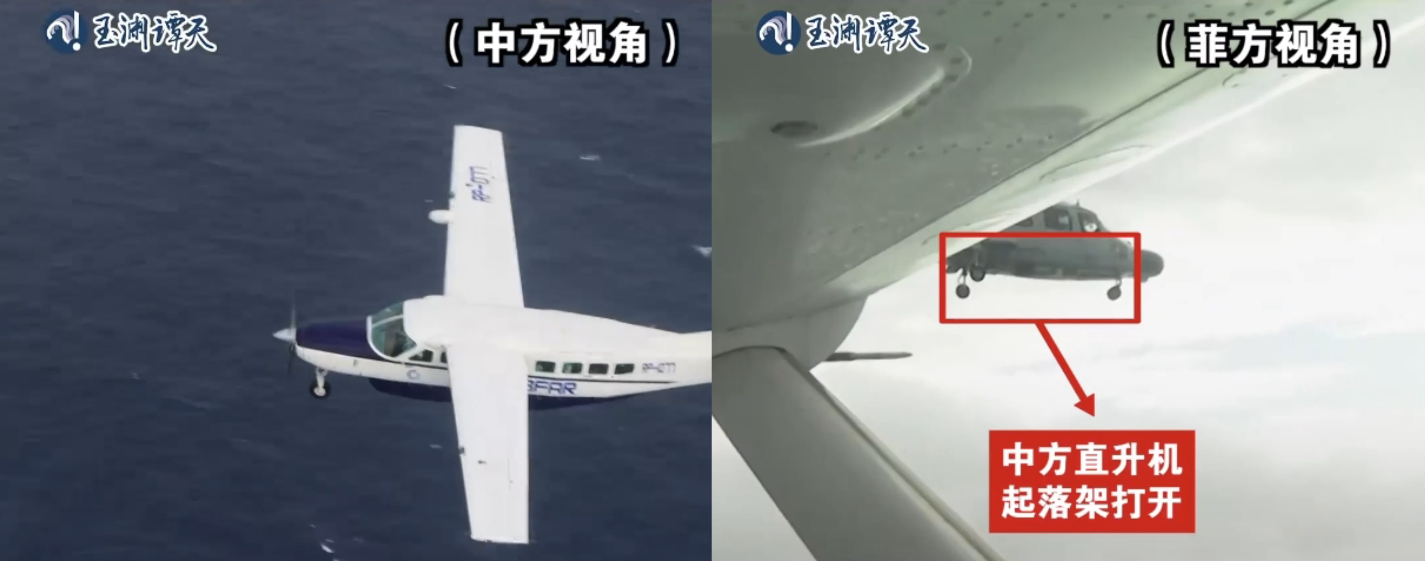軍事專家張軍社對畫面進行了細緻分析,從飛行航跡上來看,它想查明航道口附近中國有什麼船隻。菲方C-208型機是政府公務機,它不是一個單純的民用飛機,是固定翼飛機。它的噸位比我們的直升機要大,直升機的螺旋槳如果碰到它的固定翼,螺旋槳就很危險,直升機就有可能墜入海中。