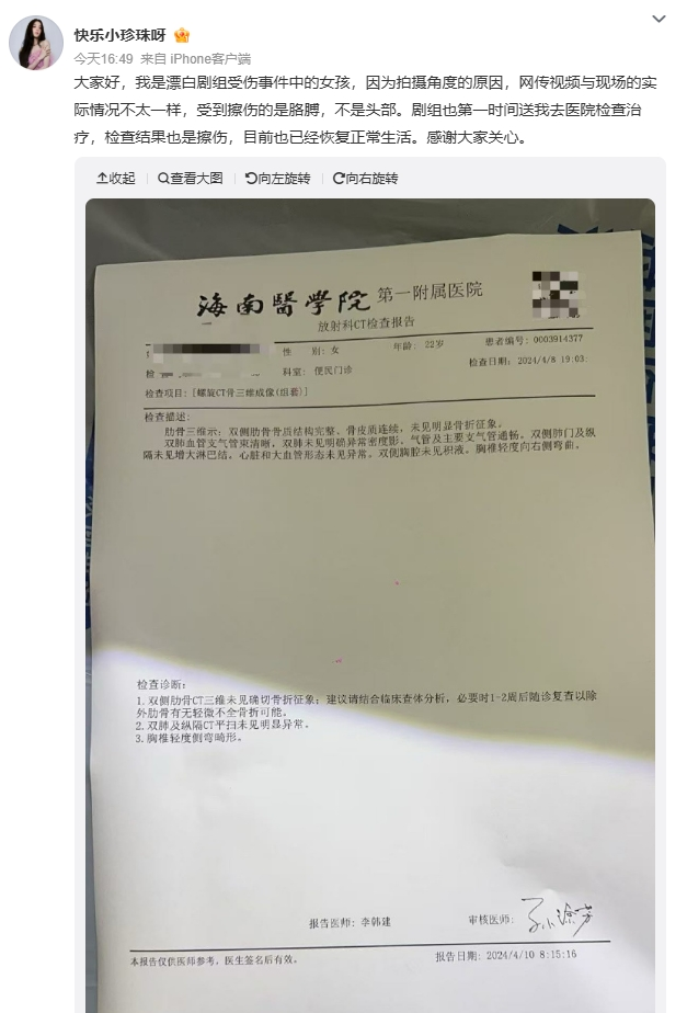 2月22日,自稱為漂白劇組受傷事件當事人的@快樂小珍珠呀 發佈消息稱:“因為拍攝角度的原因,網傳視頻與現場的實際情況不太一樣,受到擦傷的是胳膊,不是頭部。劇組也第一時間送我去醫院檢查治療,檢查結果也是擦傷,目前也已經恢復正常生活。感謝大家關心。 ”