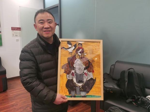 此次趁着寒假期間,邀請幾位定日師生到上海,也是對災後孩子們進行心理疏導工作的一部分。汪海鯨表示,在地震重災區的曲洛鄉措昂村,安置點的孩子們有一支球隊,叫“犛牛隊”,該隊隊長就是強巴丹增。巧合的是,此次他們帶來的繪畫中,就有一幅畫的是強壯的犛牛載人前行。