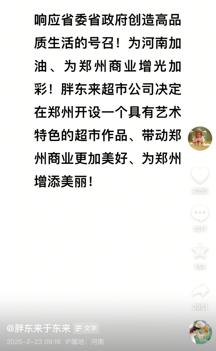 於東來在社交媒體發文稱,“響應省委省政府創造高品質生活的號召!為河南加油、為鄭州商業增光加彩!胖東來超市公司決定在鄭州開設一個具有藝術特色的超市作品、帶動鄭州商業更加美好、為鄭州增添美麗!”