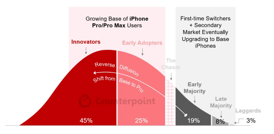 其中,Pro用户中45%認為自己是科技創新者,25%則認為自己是老牌iPhone用户,這種自我認同促使其更願意頻繁更新iPhone。而使用非Pro的iPhone時間越長,用户則越傾向於跨越鴻溝升級為Pro來體驗新功能,而不是轉向三星Galaxy S等高端安卓手機。