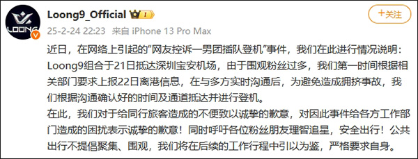 @Loong9_Official 表示,對於給同行旅客造成的不便致以誠摯的歉意,對因此事件給各方工作部門造成的困擾表示誠摯的歉意!同時呼籲各位粉絲朋友理智追星,安全出行!公共出行不提倡聚集、圍觀,我們將在後續的工作行程中引以為鑑,嚴格要求自身。