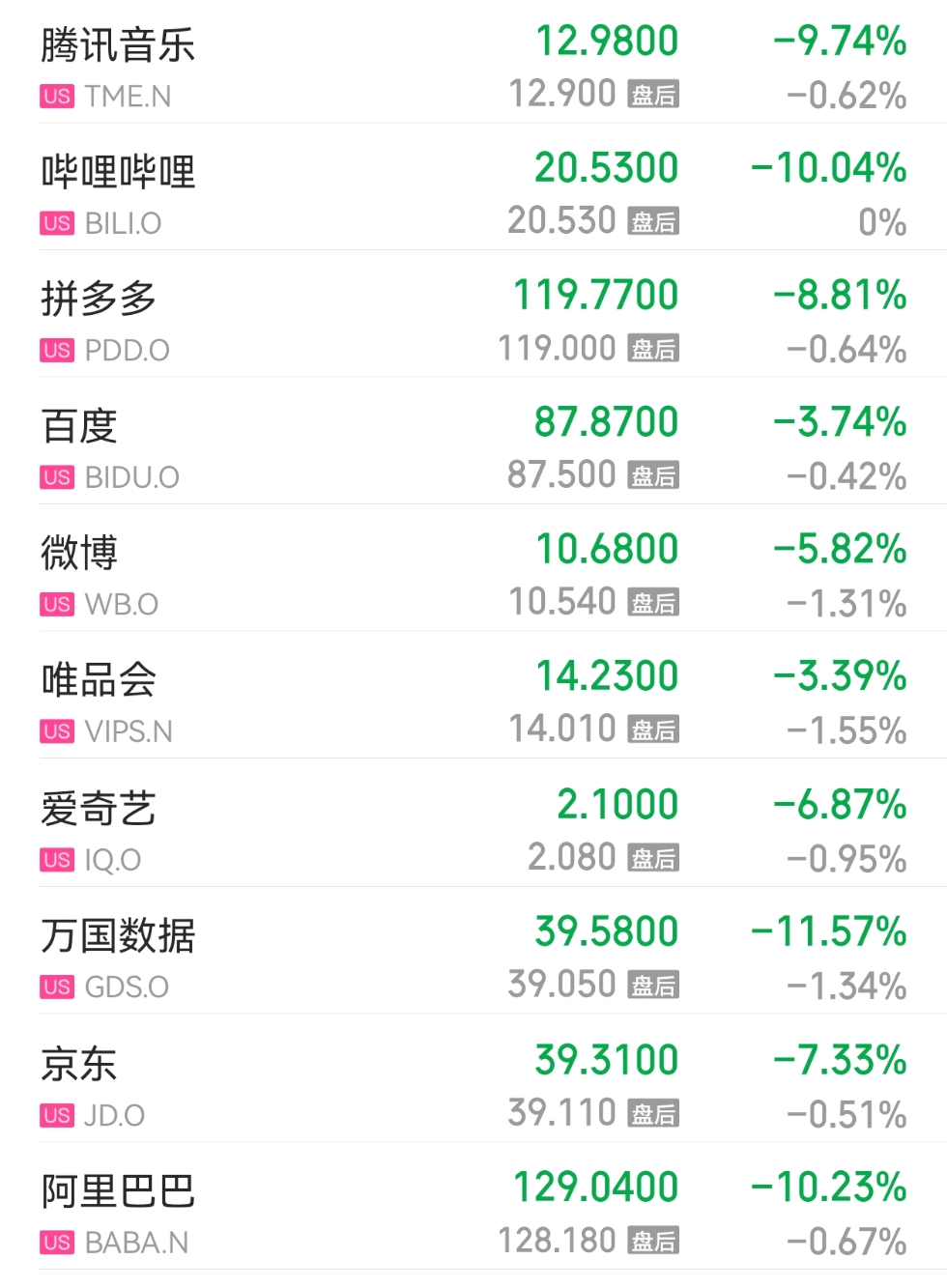 受大盤等多方面因素拖累,昨夜中概股普遍下跌,納斯達克中國金龍指數(HXC)大跌5.24%。熱門中概股跌勢明顯,其中:阿里巴巴、嗶哩嗶哩跌超10%,IDC龍頭企業萬國數據跌超11%;騰訊音樂下跌9.74%,拼多多下跌8.81%,京東下跌7.33%,愛奇藝下跌6.87%,百度下跌3.74%。