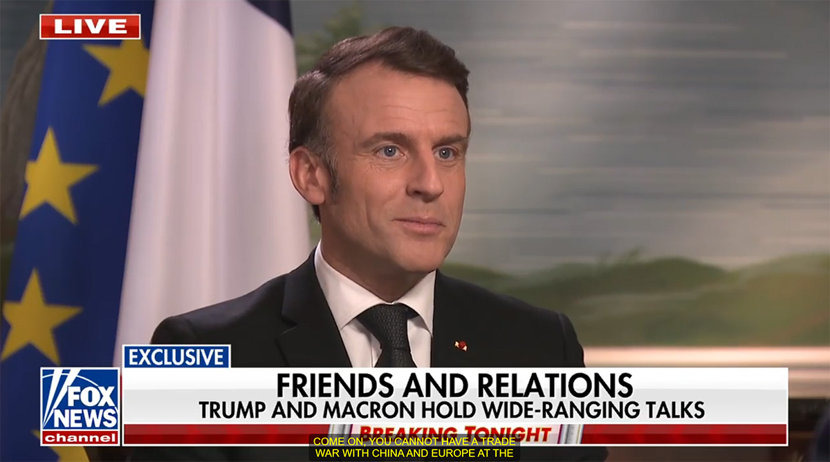 當地時間24日,法國總統馬克龍接受美國福克斯新聞網採訪時稱,“你們(美國)不能同時對中國和歐洲發動貿易戰”。 視頻截圖