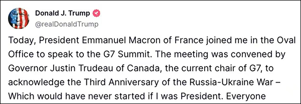 與馬克龍會晤後,特朗普還在“真相社交”上發文朝七國集團(G7)主席國加拿大的總理特魯多喊話,再次戲稱他為“加拿大州長”,感謝特魯多在俄烏衝突三週年之際組織了此次會晤,還不忘強調“如果我是總統,這一切都不會發生”。