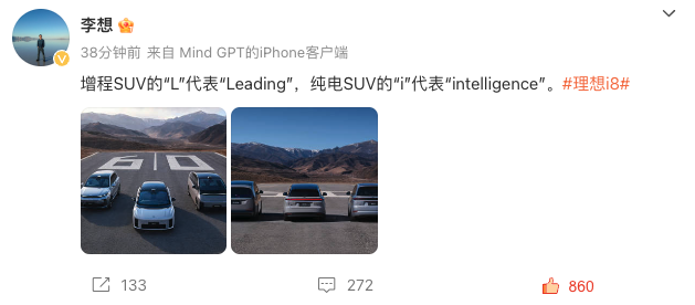 隨後,理想汽車CEO李想在微博解讀了i系列的命名策略。李想表示,增程SUV的“L”代表“Leading(領先)”,純電SUV的“i”代表“intelligence(智能)”。
