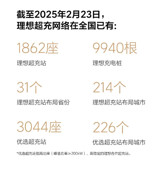 為了解決用户購買純電產品的補能問題,理想汽車從2024年開始就大力建設超充網絡。根據理想汽車官方的信息,截至2025年2月23日,理想汽車在全國共建設了1862座理想超充站(9940根理想充電樁),覆蓋31個省份和214個城市。