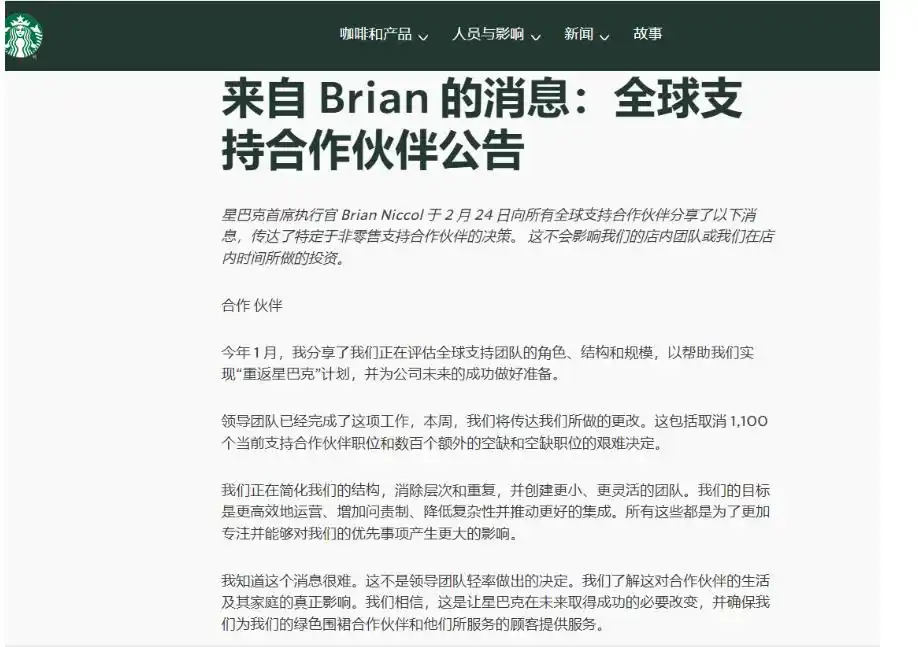 2月24日晚間,星巴克董事長、首席執行官布萊恩·尼科爾(Brian Niccol)在致員工的一封信中指出,1月,我們分享了正在評估全球支持團隊的角色、結構和規模,以幫助我們實現‘重返星巴克’計劃。本週,我們將傳達所做的更改。這包括取消1100個現有的職位和數百個額外的空缺職位。”