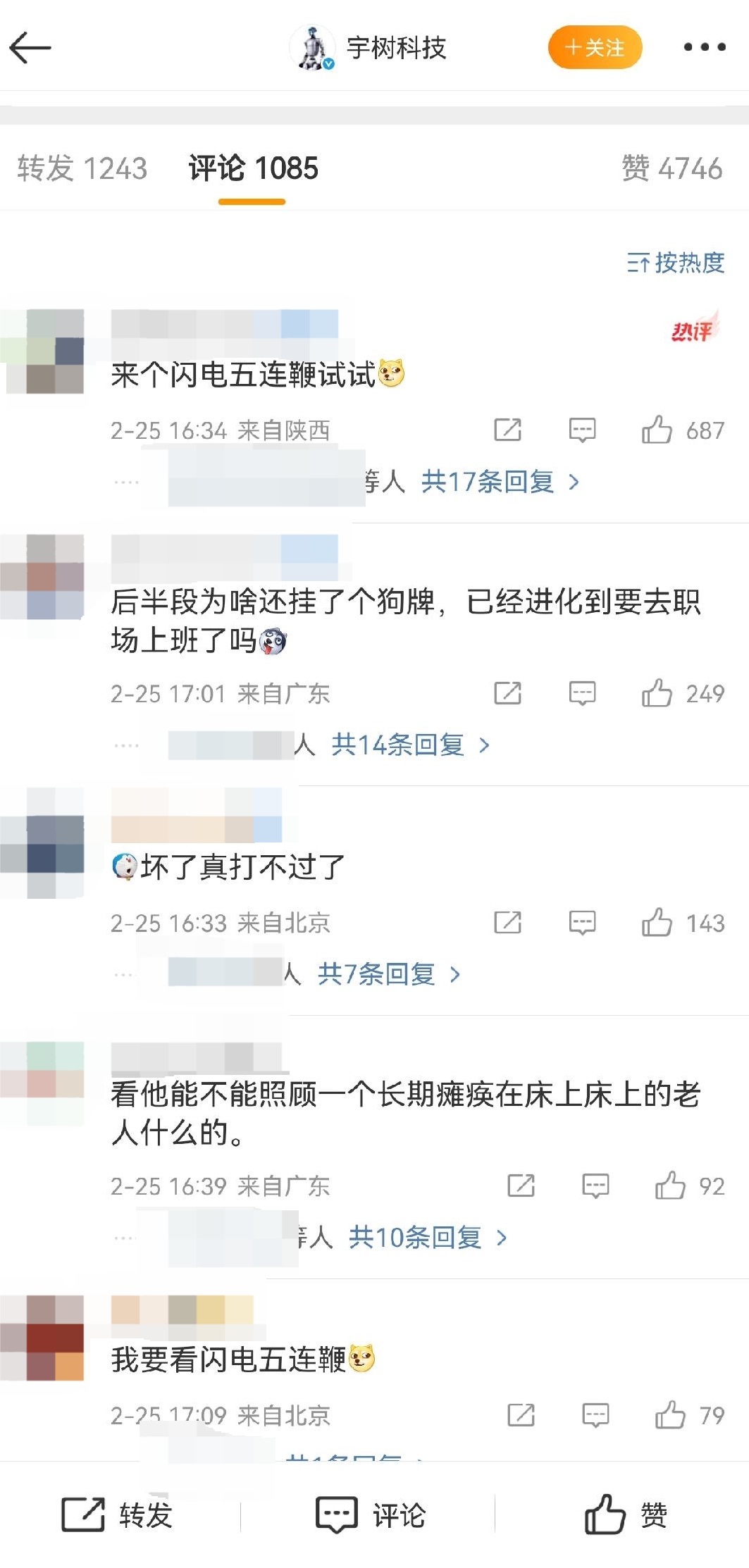 2月25日下午,宇樹科技在其微博上展示了一段視頻,宇樹旗下的機器人演示了出拳、扭腰靈活轉身、空中迴旋踢等一系列流暢動作,讓網友感到驚歎。宇樹官方在配文中寫道,“算法繼續升級,任意動作任意學,大家還想看他跳什麼,請發到評論區。”