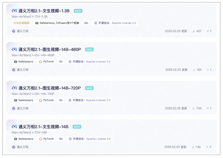 2月25日晚間,阿里巴巴宣佈,阿里雲視頻生成大模型萬相2.1(Wan)開源。此次開源採用Apache2.0協議,14B和1.3B兩個參數規格的全部推理代碼和權重全部開源,同時支持文生視頻和圖生視頻任務,全球開發者可在Github、HuggingFace、魔搭社區下載體驗。