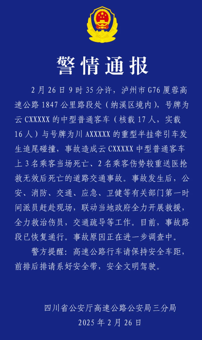 2月26日9時35分許,瀘州市G76廈蓉高速公路1847公里路段處(納溪區境內),號牌為雲CXXXXX的中型普通客車(核載17人,實載16人)與號牌為川AXXXXX的重型半掛牽引車發生追尾碰撞,事故造成雲CXXXXX中型普通客車上3名乘客當場死亡、2名乘客傷勢較重送醫搶救無效後死亡的道路交通事故。事故發生後,公安、消防、交通、應急、衞健等有關部門第一時間派員趕赴現場,聯動當地政府全力開展救援,全力救治傷員,交通疏導等工作。目前,事故路段已恢復通行。事故原因正在進一步調查中。
