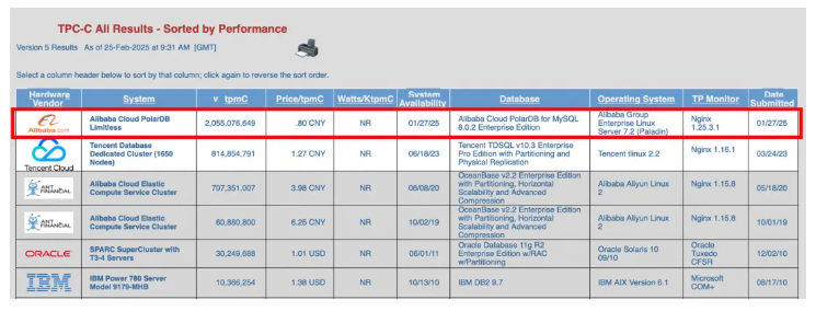 據微信公眾號“阿里雲”2月26日消息,阿里雲PolarDB雲原生數據庫,日前登頂全球數據庫性能及性價比排行榜。報道稱,該產品以每分鐘20.55億筆交易(tpmC)和單位成本0.8元人民幣(price/tpmC)的成績,成功刷新TPC-C性能和性價比雙榜的世界紀錄。