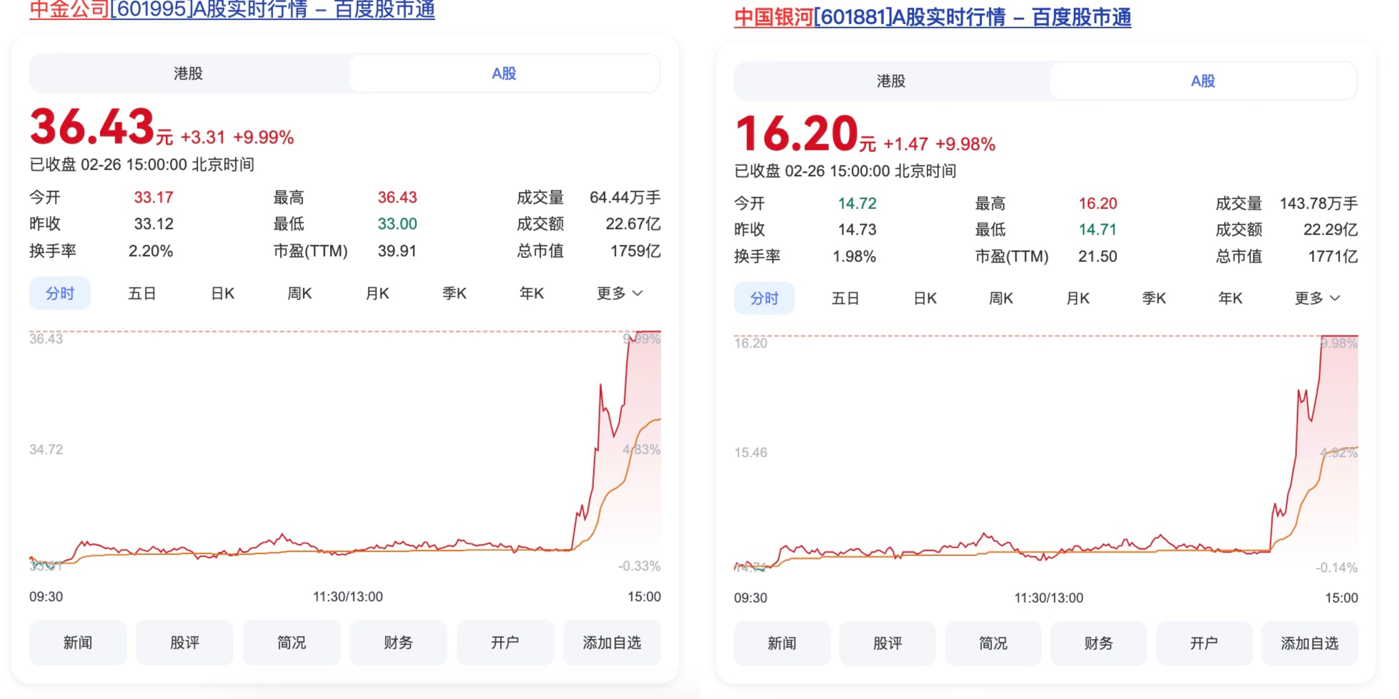 2 月 26 日,中金公司(601995)與中國銀河(601881)在尾盤時段突然直線拉昇,最終雙雙封死漲停板 ,截至當日收盤,中金公司報收 36.43 元,漲幅 9.99%;中國銀河報收 16.20 元,漲幅 9.98%。二者的港股同樣表現強勁,中金公司 H 股(03908.HK)收漲 16.30%,報 15.84 港元;中國銀河 H 股(06881.HK)收漲 16.58%,報 8.72 港元。