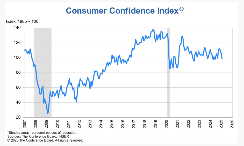消費者信心指數的降低,和美國新政府帶來的不確定有關:比如通脹、關税和貿易戰。