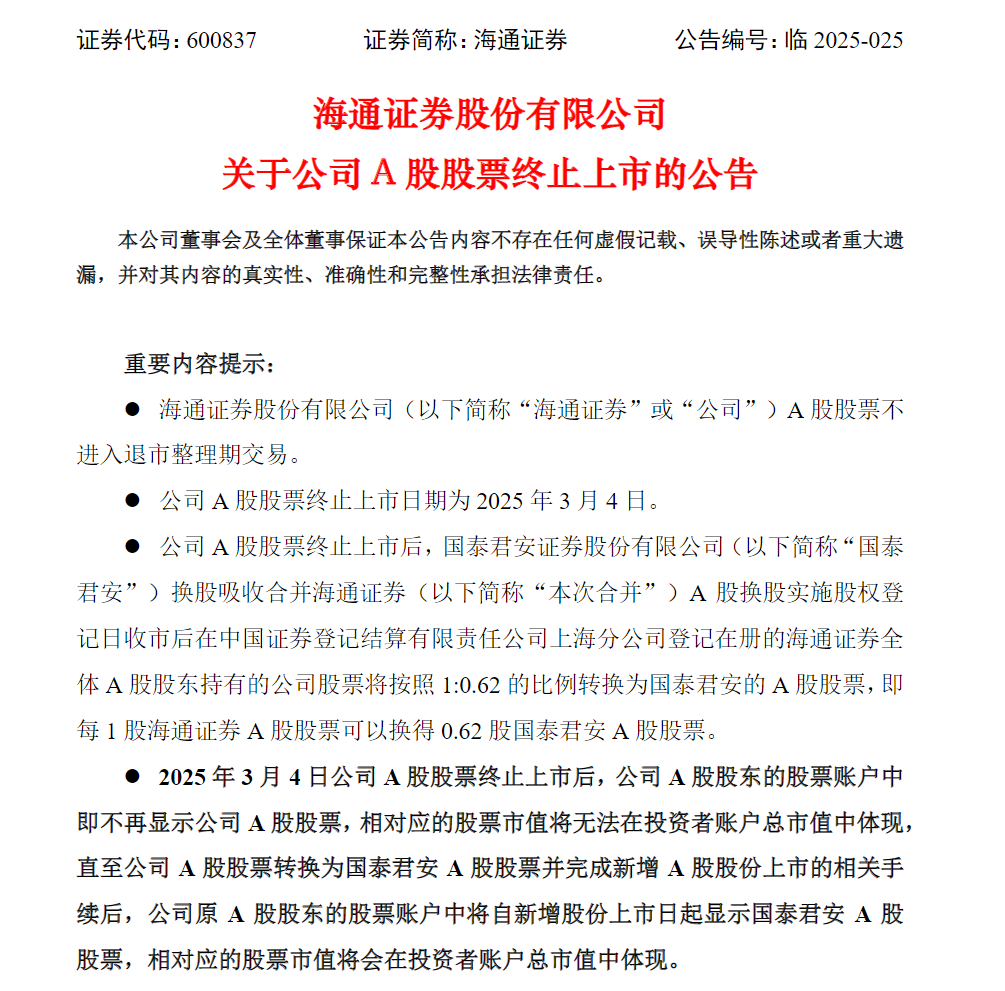 2月25日盤後,海通證券公告稱,上交所決定對公司A股股票予以終止上市。公司A股股票不進入退市整理期交易,將於3月4日終止上市。