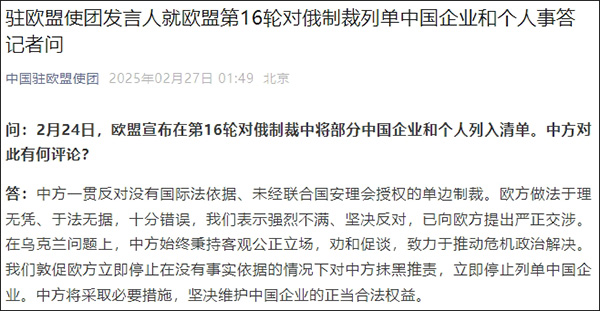 據微信公眾號“中國駐歐盟使團”2月27日消息,中國駐歐盟使團發言人就歐盟第16輪對俄製裁列單中國企業和個人事答記者問。